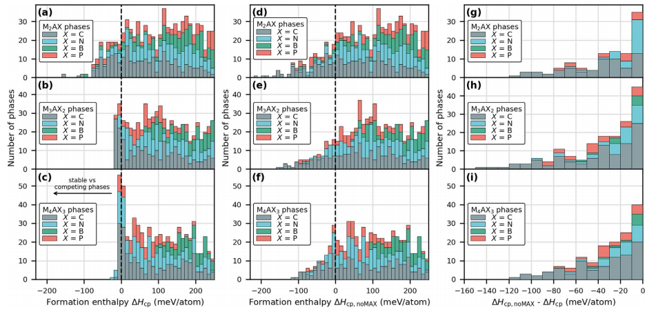 圖14 不同競爭相組的計算穩定性ΔHcp。 (a-c) 考慮來自Material Project和不同階段MAX相的所有競爭相,以及(d-f)僅來自Materials Project,排除MAX相。 (g-i) (d-f)和(a-c)中數據計算穩定性的差異。著色表示MAX相的X元素,其中C為灰色,N為藍色,B為綠色。箱大小為10 meV/atom。