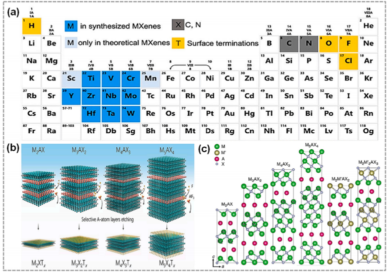 圖1. (a) 周期表顯示MXenes的化合物。用于創建MXenes的元素顏色編碼[46]。(b) 各種MXenes的示意圖[48]。(c) 六種不同晶體MAX相的原子結構。a軸和c軸是所有結構的共有特征。不同層中的過渡金屬用“M1”和“M2”表示,以表示同一層中過渡金屬之間的不同鍵(M1M1或M2M2)和不同層中的鍵(M1M2)。在M_n+1AX_n(n=1-4)中,M1和M2是相同類型的過渡金屬,而在M2M'AX2和M2M'2AX3中,它們是不同的類型[49]。