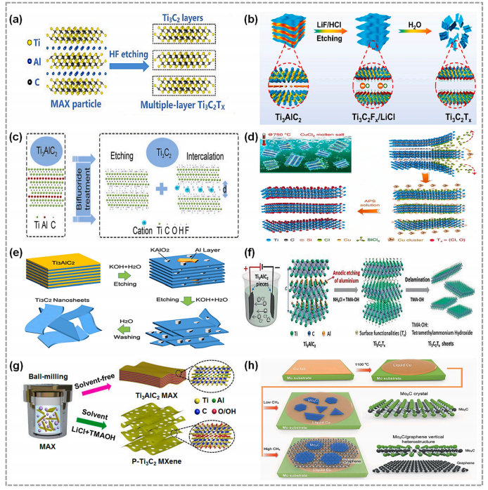 圖3.(a) HF蝕刻Ti3AlC2 [50]。(b) 酸/鹽溶液蝕刻Ti3AlC2 [38]。(c) XHF2雙氟化物蝕刻Ti3AlC2 [62]。(d) 高溫下通過熔融鹽剝離Lewis酸蝕刻Ti3AlC2 [65]。(e) 堿性KOH溶液蝕刻Ti3AlC2 [66]。(f) 電化學蝕刻[67]。(g) 通過化學聯合球磨合成多孔Ti3C2 [69]。(h) CVD方法在低和高CH4流量下Mo2C晶體的生長[71]。