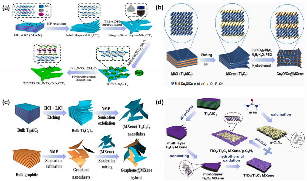 圖5.MXene基復合催化劑的合成方法:(a) 使用水熱法的Bi2WO6/Nb2CTx納米片[82]。(b) 使用溶劑熱法的Cu2O/Cu@MXene復合材料[94]。(c) 使用超聲波法的石墨烯@MXene雜化材料[102]。(d) 使用靜電自組裝的TiO2/Ti3C2 MXene/g-C3N4異質結構[120]。