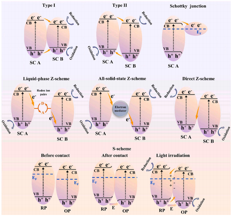 圖6.不同類型的光催化異質結及其電荷載流子轉移途徑的示意圖(SC:半導體,A:電子受體,D:電子供體,RP:還原光催化劑,OP:氧化光催化劑)[161]。