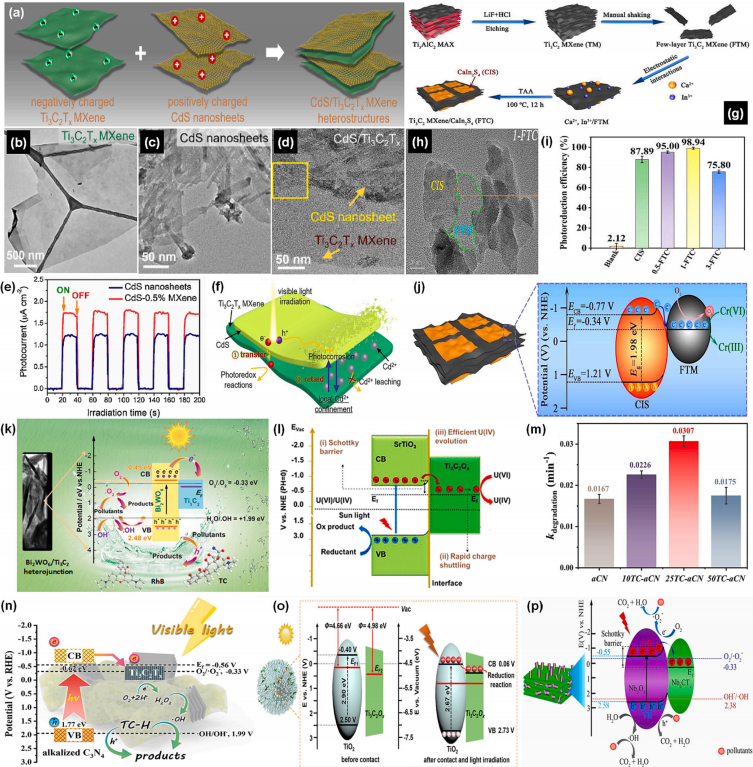圖7. (a) CdS/Ti3C2Tx異質結構的示意圖,(b) Ti3C2Tx納米片的透射電子顯微鏡(TEM)圖像,(c) 純CdS納米片,(d) CdS/Ti3C2Tx異質結構,(e) 4-NA在CdS/Ti3C2Tx上的光電流密度,(f) Ti3C2Tx增強CdS光穩定性的示意圖[163]。(g) TisC2 MXene/CaIn2S4 (FTC) 復合材料的合成示意圖,(h) FTC的透射電子顯微鏡(TEM)圖像,(i) 不同樣品上Cr(VI)光還原的光催化效率常數,(j) FTC肖特基結中可能的電荷轉移路徑和光催化機制的示意圖[164]。(k) Bi2WO6/Ti3C2體系的光降解和可能的反應機制示意圖[166]。(l) Ti3C2/SrTiO3混合體系的光催化機制和電荷轉移過程[167]。(m) 不同增量負載Ti3C2Tx的所制備光催化劑的相應動力學速率常數,(n) 提出TC降解在Ti3C2Tx堿化g-C3N4 (TC-aCN)復合材料上的光催化機制[131]。(o) TiO2/Ti3C2O光催化劑的能帶圖和光催化反應機制示意圖8]。(p) Nb2O5/Nb2CTx混合體在光催化過程中光生電荷的分離和轉移的可能機制]。