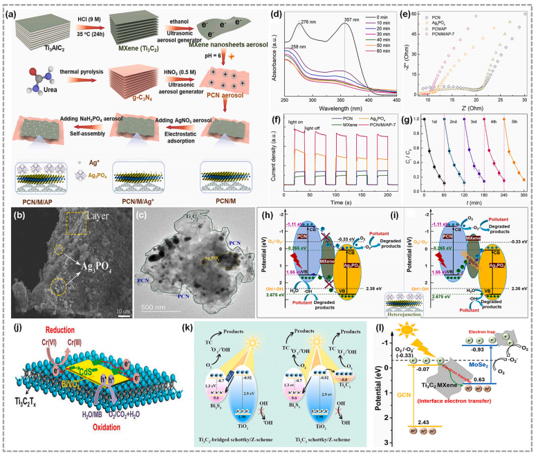 圖9. (a) PCN/M/AP混合光催化劑合成過程的示意圖,(b,c) g-C3N4/MXene/Ag3PO4 (PCN/M/AP)的掃描電子顯微鏡(SEM)和透射電子顯微鏡(TEM)圖像,(d) PCN/M/AP在不同時間下對四環素(TC)降解過程的紫外-可見吸收光譜變化,(e) 電化學阻抗譜(EIS),(f) 樣品的瞬態光電流響應,(g) PCN/M/AP在5個循環中的光催化性能,傳統(h)和S-scheme(i)在PCN/M/AP界面上的光生載流子轉移路徑的可能光催化機制[184]。(j) 在BiVO4-CdS異質結構中構建Z-scheme和共催化劑效應用于光催化還原和氧化反應[188]。(k) TisC2橋接的肖特基/Z-scheme, 肖特基/Z-scheme的可能光催化機制[189]。(l) 通過Z-scheme異質結g-C3N4/Ti3C2 MXene/MoSe2 (CXM)復合材料對ENO的光催化降解機制[190]。