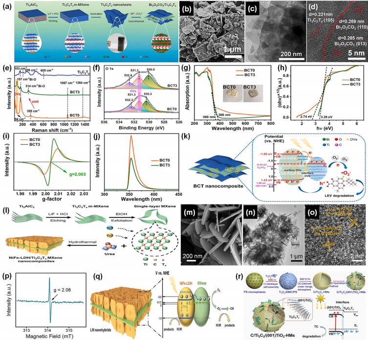 圖12. (a) Bi2O2CO3/Ti3C2Tx(BCT)制備示意圖,(b-d) BCT的掃描電子顯微鏡(SEM)、透射電子顯微鏡(TEM)和高分辨率透射電子顯微鏡(HRTEM)圖像,(e) 樣品的拉曼光譜,(f) 不同樣品的高分辨率X射線光電子能譜(XPS)O 1s譜,(g) 紫外-可見漫反射光譜,(h) 不同樣品的Tauc圖,(i) 電子順磁共振(EPR)光譜,(j) 光致發光(PL)光譜,(k) BCT光催化降解LEV的機制[213]。(l) NiFe-LDH/Ti3C2Tx MXene(LM)納米復合材料的合成示意圖,(m) LM的掃描電子顯微鏡(SEM)圖像,(n) LM的透射電子顯微鏡(TEM)圖像,(o) LM的高分辨率透射電子顯微鏡(HRTEM)圖像,(p) LM中氧空位的電子自旋共振(ESR)光譜,(q) LM納米雜化物光催化降解NOR的提出途徑[214]。(r) C/Ti3C2/(001)TiO2-HMs的制備示意圖和光催化降解TC的提出機制[216]。