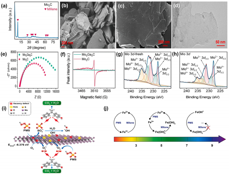 圖13.(a) Mo?C MXene的XRD, (b) Mo?Ga?C和(c) Mo?C MXene的SEM圖像, (d) Mo?C MXene的TEM圖像, (e) EIS圖譜, (f) Mo?Ga?C和Mo?C MXene的EPR,Mo 3d的高分辨率XPS光譜(g)新鮮的和(h)用過的Mo?C MXene, (i) Mo?C MXene激活PMS降解BPA的提出機制[251]。 (j) 溶液pH對PMS/Fe(III)/MXene中PMS激活的可能影響機制[256]。