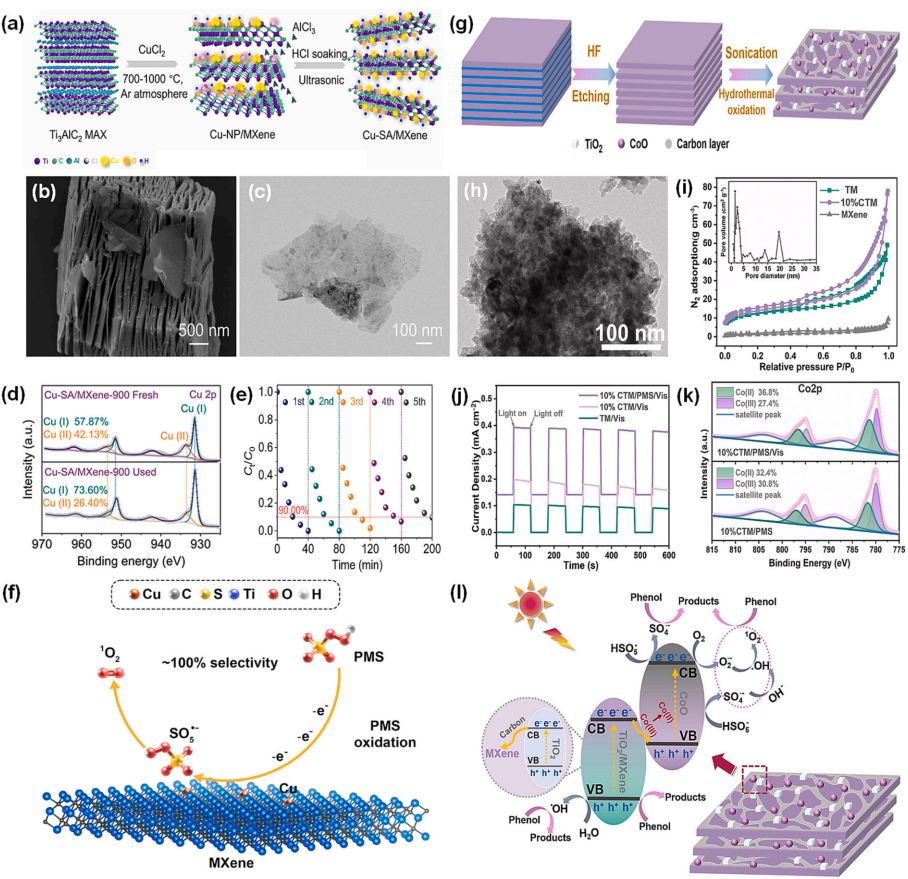 圖14. (a) Cu-SA/MXene催化劑合成的示意圖,(b, c) Cu-SA/MXene的SEM和TEM圖像,(d) Cu-SA/MXene在新鮮和使用后的Cu 2p的XPS光譜,(e) Cu-SA/MXene的穩定性測試,(f) Cu-SA/MXene/PMS產生^1O_2的機制[266]。 (g) CoO@TiO2/MXene雜化物的合成策略的示意圖,(h) CoO@TiO2/MXene(CTM)的TEM圖像,(i) TM、CTM和純MXene催化劑的N2吸附-脫附等溫線(插圖顯示了CTM催化劑的孔徑分布),(j) 不同系統的瞬態光電流響應,(k) CTM/PMS/Vis和CTM/PMS系統中Co 2p的高分辨率XPS光譜,(l) 在CoO@TiO2/Ti3C2/PMS/Vis系統中催化降解苯酚的擬議方案[274]。