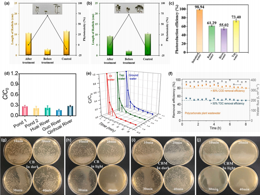 圖15.使用(a)Vigna radiata和(b)Vigna unguiculata處理前后RhB的植物毒性。插圖顯示了Vigna radiata和Vigna unguiculata種子在不同樣品下的發芽情況,分別為:1. 處理后,2. 處理前和3. 對照組[281]。(c) 使用不同水源的Cr(VI)光還原效率[164]。(d) 五種實際水體中BPA的降解百分比[251]。(e) 不同水體基質中ONZ的降解[258]。(f) Cu-SA/MXene/PMS/PVDF系統處理聚碳酸酯植物廢水的效果[266]。(g, i) 黑暗中的生態毒性實驗和(h, j) 可見光下g-C3N4/BiOBr(CB)和g-C3N4/BiOBr/MXene (CBM)的光催化抑菌實驗[195]。