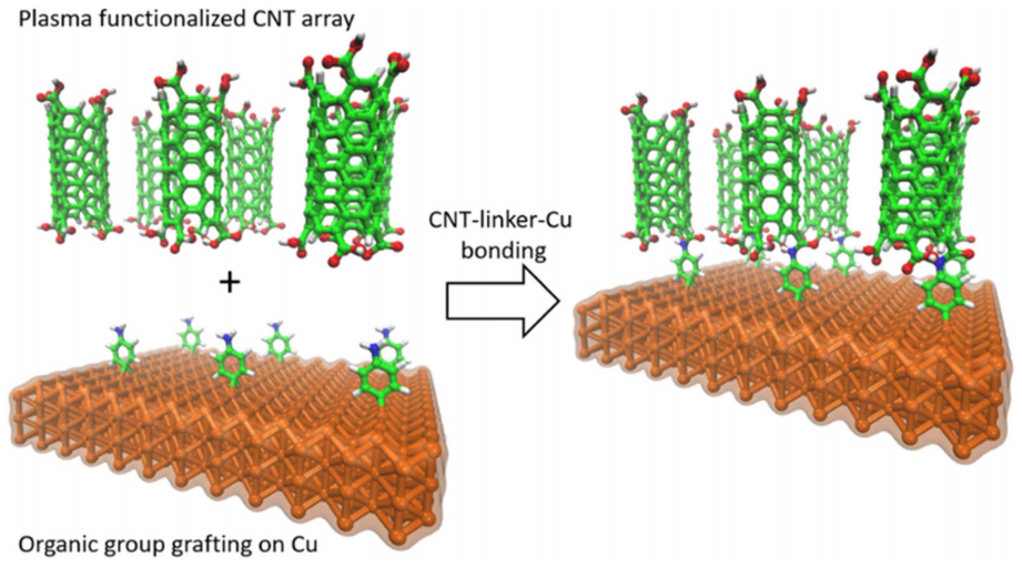 創(chuàng)新的鍵合機制設(shè)計:通過氨基苯基連接劑作為橋梁,在Cu表面形成有機層,再與CNT開口端的羧基功能團(tuán)形成酰胺鍵,實現(xiàn)了分子級別的精確鍵合。