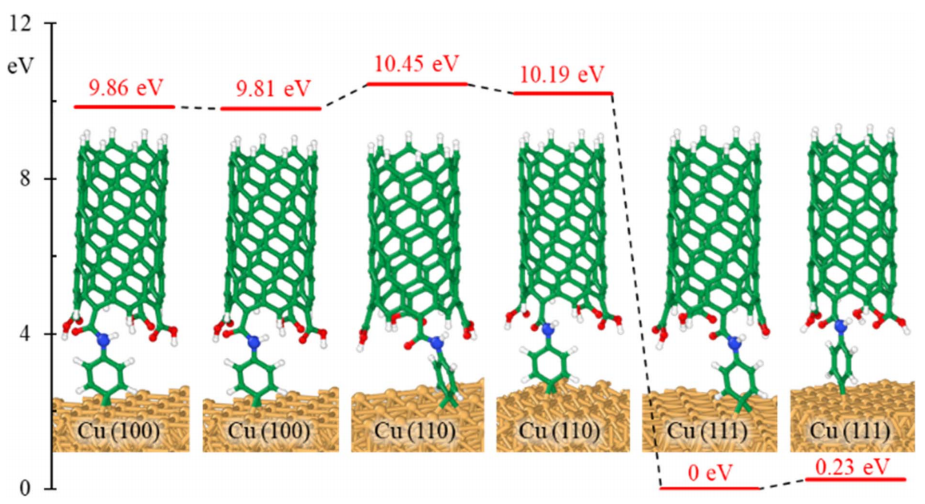 圖4 氨基苯基通過橋接或頂端配位方式在不同銅晶面(100/110/111)上連接碳納米管的相對能量分布。能量值以最穩(wěn)定構(gòu)型為基準(zhǔn)(0 eV)。氮(藍(lán)色)、碳(綠色)、氫(白色)和銅(橙色)。