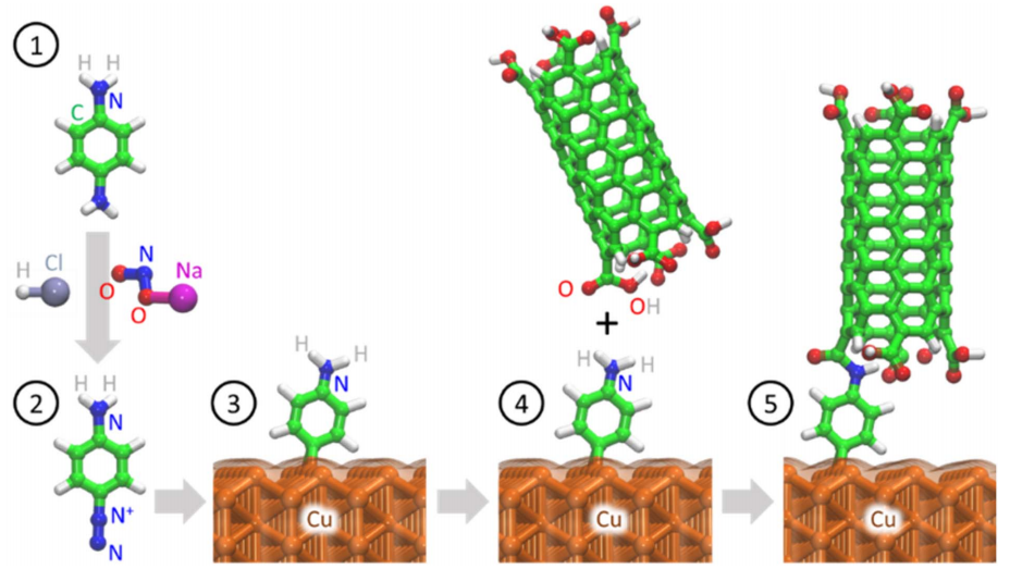 圖6 銅表面功能化及后續(xù)羧基修飾碳納米管尖端連接的機理示意圖。氮(藍(lán)色)、碳(綠色)、氫(白色)、氧(紅色)和銅(橙色)。