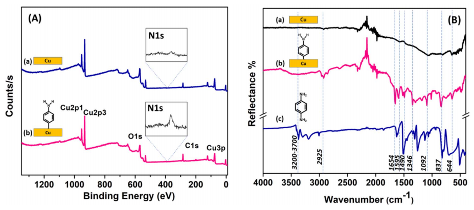 圖7 (A)裸銅(藍(lán)色)與氨基苯基接枝銅表面(反應(yīng)時間5秒,粉色)的XPS全譜掃描。插圖為N元素特征峰的放大顯示。(B)紅外光譜:(a)裸銅表面,(b)氨基苯基接枝銅表面(反應(yīng)時間5分鐘),(c)固態(tài)對苯二胺參比樣。