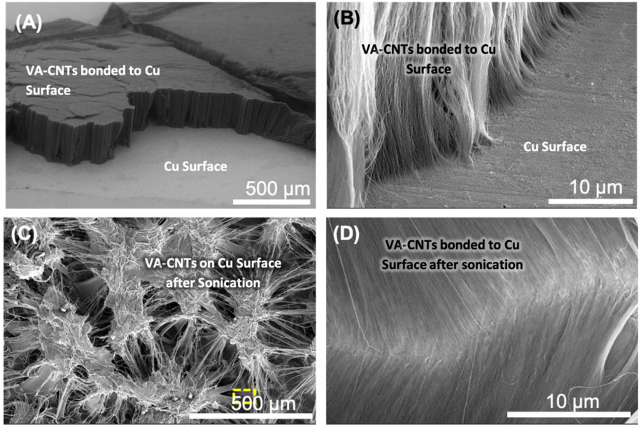 圖8 共價鍵合銅金屬表面的垂直取向碳納米管(VA-CNTs)在超聲處理前后的SEM圖像:(A)附著于銅基底的碳納米管陣列側(cè)視圖;(B)銅基底上開口VA-CNTs的高倍率圖像;(C)超聲處理后VA-CNT陣列的低倍率俯視圖;(D)超聲處理后VA-CNT陣列的高倍率俯視圖。