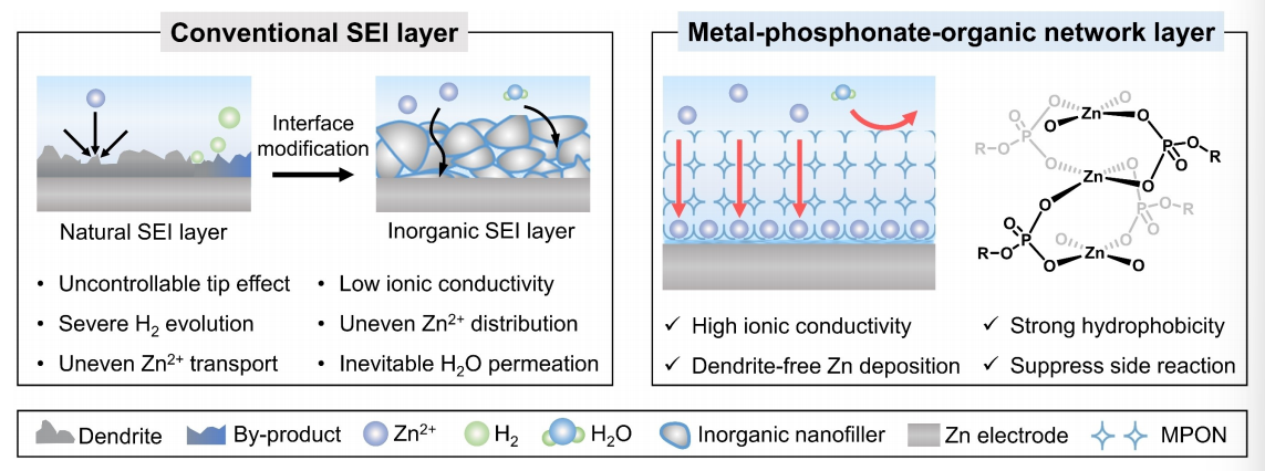Scheme 1. 不同界面層的結構及鋅沉積行為示意圖。左:采用常規固體電解質界面(SEI)層保護的鋅金屬電極中的鋅沉積行為,包括自然SEI層和無機納米填料層。右:金屬-膦酸酯-有機網絡(MPON)層優化的離子傳輸行為及其對應的Zn位點局部配位環境。