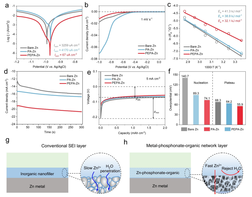(a) 使用三電極系統,掃描速率為1 mV s?¹時收集的PEPA-Zn、PA-Zn和裸Zn電極的線性極化曲線(在相同條件和有效表面積下)。三電極電池使用Zn箔作為工作電極,Ti箔作為對電極,Ag/AgCl電極作為參比電極。