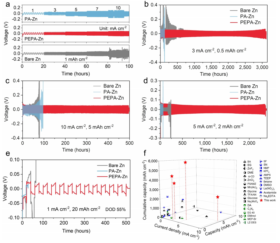 (f) PEPA電解質中對稱電池的累積容量、電流密度和鋅電鍍/剝離容量與之前報道的通過不同添加劑穩定的優秀鋅金屬電極的比較。