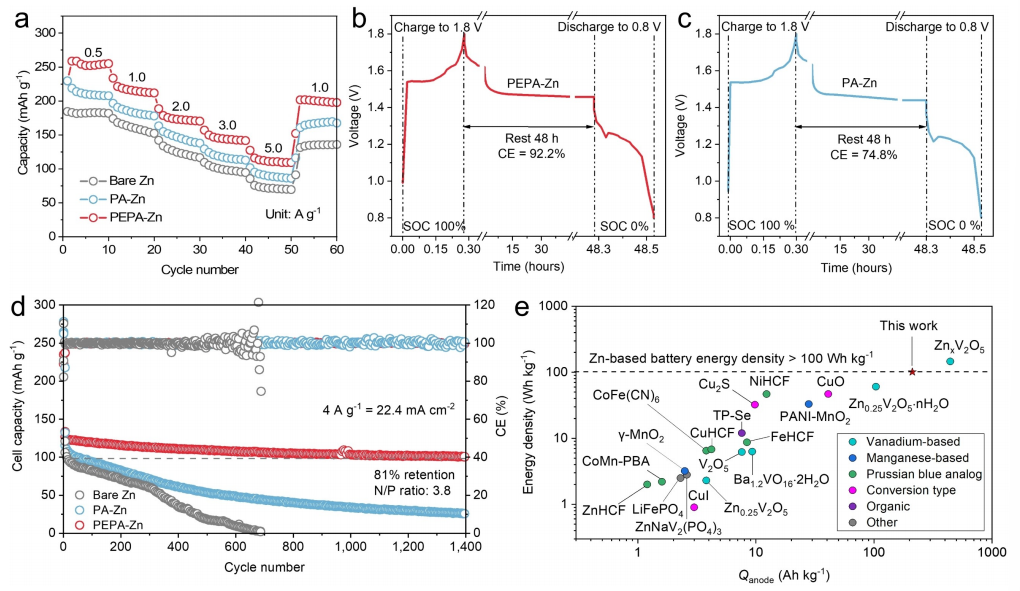 總結:圖5及文字描述了不同配置的鋅離子電池的電化學性能,包括倍率性能、充放電特性、長期循環穩定性以及能量密度的比較。