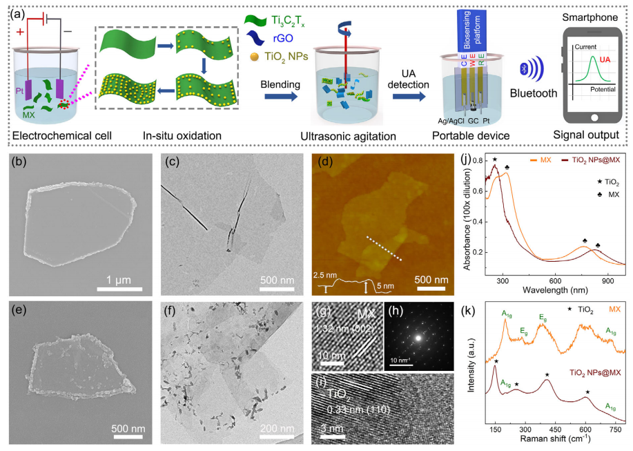 圖1. a)‌ 使用“現場轉化”策略制備的TiO? NPs@MX納米片改性電極構建的便攜式尿酸(UA)檢測傳感器的示意圖。Ti?C?T? MX納米片:‌b)‌ 掃描電子顯微鏡(SEM)圖像,‌c)‌ 透射電子顯微鏡(TEM)圖像,和 ‌d)‌ 原子力顯微鏡(AFM)圖像。TiO? NPs@MX納米片:‌e)‌ SEM圖像,‌f)‌ TEM圖像,和 ‌g-i)‌ 高分辨率透射電子顯微鏡(HRTEM)圖像。對應的 ‌j)‌ 紫外-可見(UV-vis)光譜,和 ‌k)‌ 拉曼光譜。