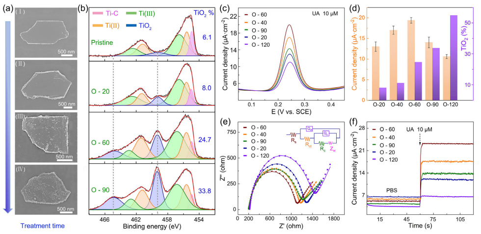 · ‌解析‌:這部分描述了研究的核心內容,即使用“現場轉化”策略制備的TiO?納米顆粒(NPs)和MX(Ti?C?T?)納米片復合材料改性電極,用于構建便攜式尿酸(UA)檢測傳感器。