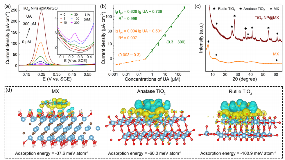 開發了電化學氧化時間精準調控的TiO? NPs@MX異質結電極,首次證實金紅石相TiO?-MX界面比銳鈦礦相具有更強的UA吸附能力(吸附能-1.58 eV),通過電荷密度差分揭示了電子轉移機制,為代謝物檢測材料設計提供了新范式。