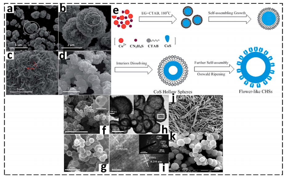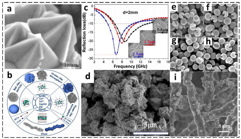 | f-i | 鈷微納結構 | 枝晶→花瓣分級組裝 | 尖銳邊緣激發局域電場,增強介電極化損耗4 |