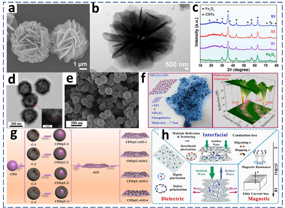 | g | CFO@C/rGO | 核殼CFO@C嵌入rGO三維網絡 | C殼層緩沖介電常數,rGO構建電荷傳輸通道 |