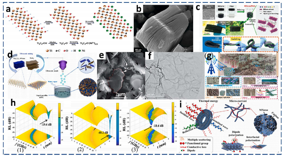 | a-b | Ni修飾Ti?C?T? MXene | 堿化擴層+Ni納米顆粒錨定(≈10 nm) | Ni顆粒增強磁損耗,表面-OH官能團促進極化弛豫 |