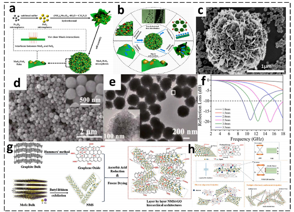 | a | MoS?/FeS?合成過程 | 采用化學還原法或自組裝策略構建異質界面,FeS?納米顆粒(≈50 nm)錨定MoS?片層,增強界面電荷分離;MoS?提供介電骨架,FeS?引入磁損耗,實現磁-介電協同優化89 |