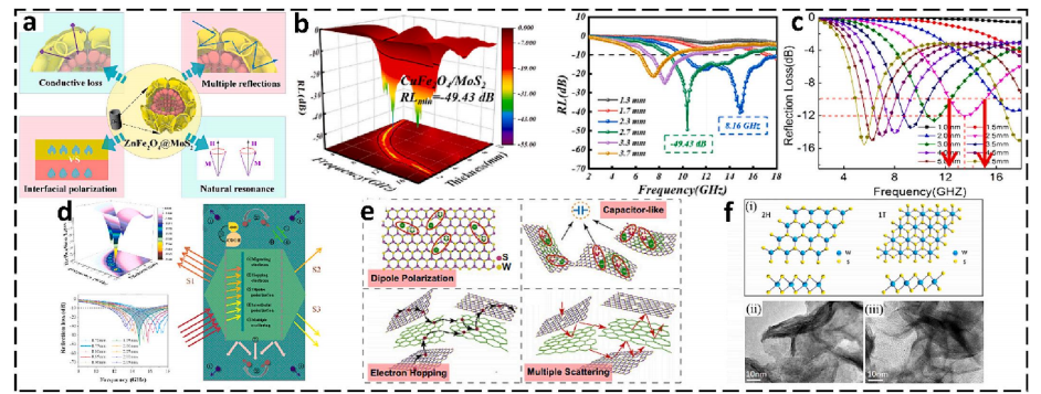 | e | WS?-rGO異質結構 | rGO橋接WS?納米片 | 四重協同:偶極極化+界面極化+電子躍遷+多重散射 |
