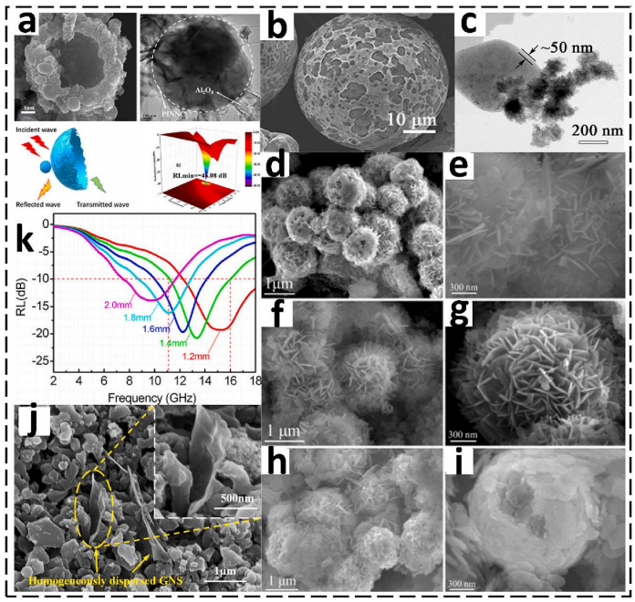| j | rGO-CoFe?O?/FeCo | 磁性顆粒嵌入rGO基體 | 磁損耗(FeCo)+介電損耗(rGO)協同 |