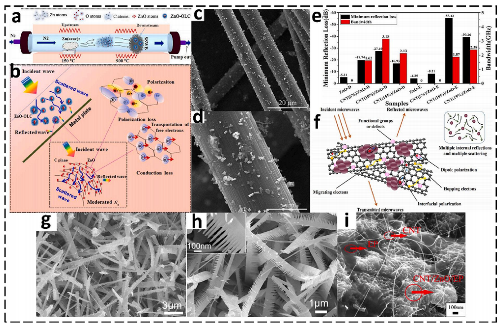 | f | CNT/ZnO復合材料 | CNT表面負載ZnO納米針(長度1–2 μm) | 協同損耗:CNT導電網絡+ZnO偶極極化 |