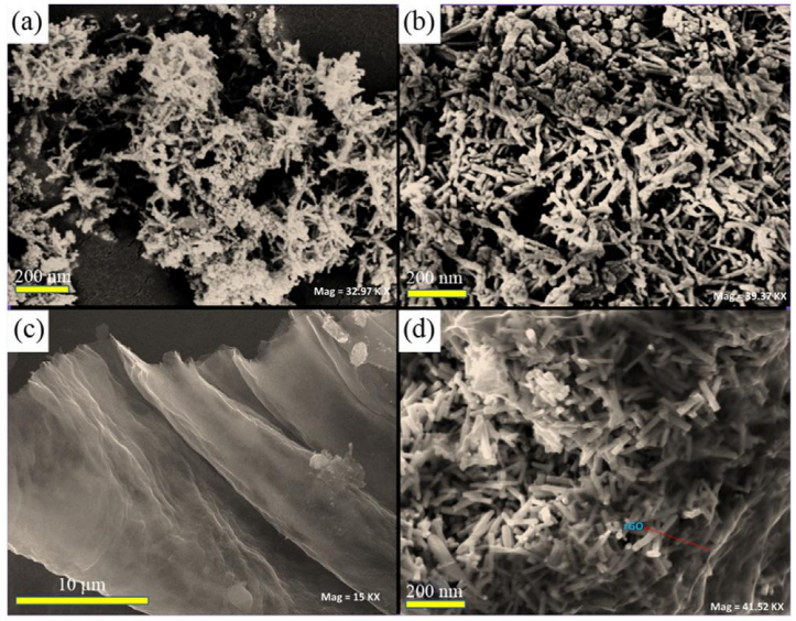 圖2. 納米材料的掃描電子顯微鏡(SEM)圖像:(a) CNFO, (b) D-CNFO, (c) rGO, (d) D-CNFO@G