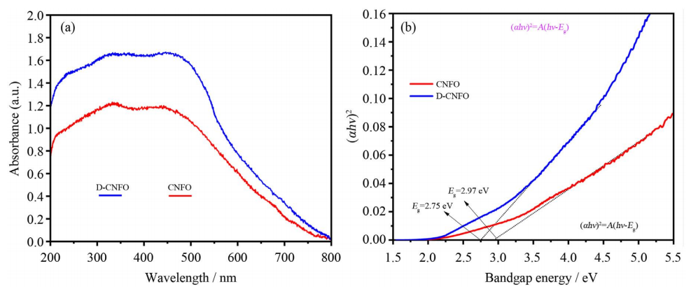 圖4. CNFO與D-CNFO納米材料的紫外-可見光譜(a)及Tauc曲線圖(b)