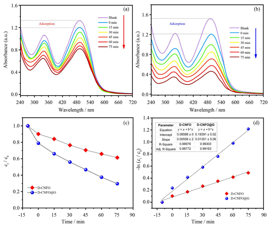圖6. D-CNFO與D-CNFO@G納米材料的偶氮染料降解性能