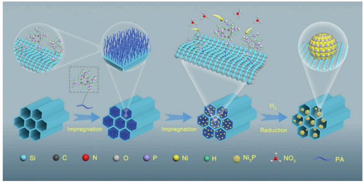 · 將吸附了Ni²?的SBA-15前驅體在氫氣氛圍下高溫還原,形成鎳或鎳磷化物納米顆粒。