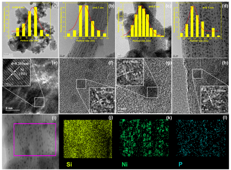 圖2. Ni/SBA-15 (a, e)、0.2PNi/SBA-15 (b, f)、0.3PNi/SBA-15 (c, g) 和 0.6PNi/SBA-15 (d, h) 的TEM及HRTEM圖像;0.3PNi/SBA-15的HAADF-STEM圖像 (i) 以及Si、Ni、P元素的EDS面掃圖譜 (i−l)
