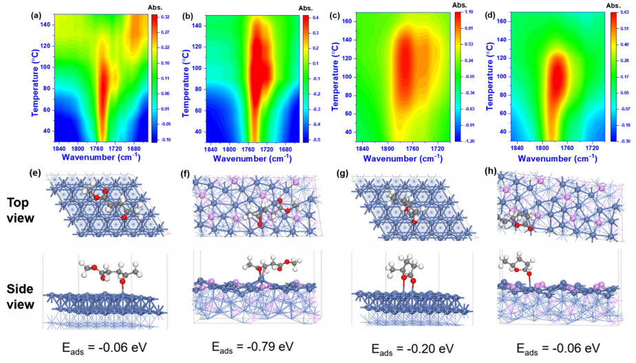 圖6. Ni/SBA-15(a、c)和0.3PNi/SBA-15(b、d)上ML與GVL的原位FTIR光譜;ML及GVL在Ni(111)(e、g)和Ni?P(141)(f、h)表面吸附優化結構的俯視圖與側視圖