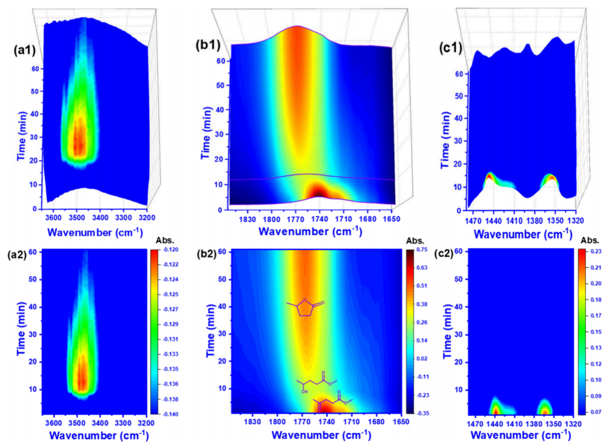 圖7. 0.3PNi/SBA-15 催化劑在 90℃ 下 ML 加氫反應的原位 FTIR 光譜(a1, a2:3200~3650 cm?¹ 區間;b1, b2:1650~1845 cm?¹ 區間;c1, c2:1320~1485 cm?¹ 區間)