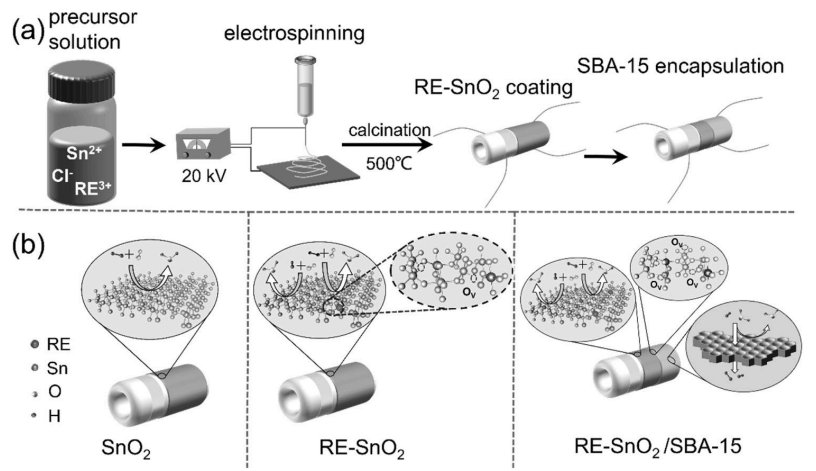 該圖展示了RE-SnO?/SBA-15傳感器的制備過程,具體步驟如下: 1.前驅體溶液準備首先,將含有稀土離子(RE³?,如Er³?或Tb³?)和Sn²?離子的混合溶液制備好。 2. 然后,將混合溶液注入靜電紡絲裝置中,通過靜電紡絲技術形成含有稀土離子的PVP/Sn²?納米纖維。 3. 接著,將紡絲得到的纖維在高溫下煅燒,使PVP分解,同時稀土離子遷移并聚集在纖維骨架上,形成RE-SnO?納米纖維。 4. SBA-15分子篩涂層最后,將制備好的RE-SnO?納米纖維涂覆在陶瓷管上,并在其表面滴涂一層介孔SBA-15分子篩粉末,干燥后再次煅燒以固定涂層。