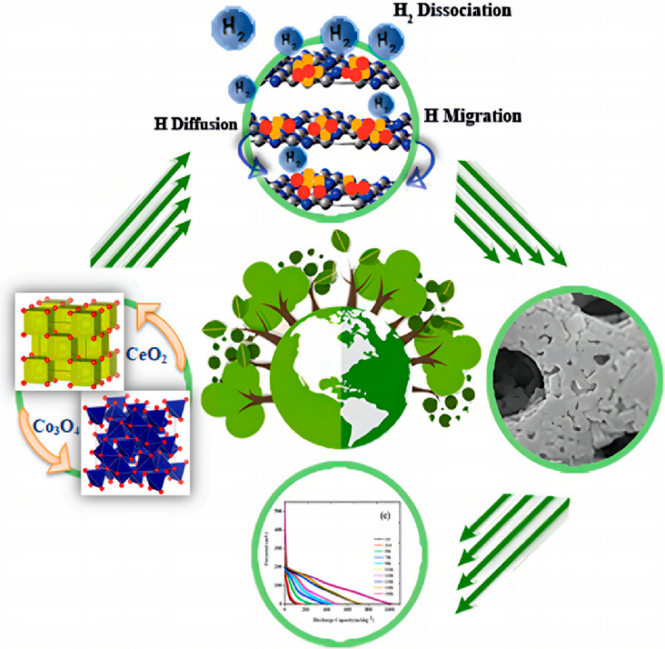 ‌圖8. 基于Co?O?−CeO?/g-C?N?納米復合材料的三元電催化劑在儲氫應用中的設計策略與溢出機理示意圖‌。