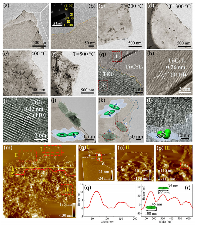 · c-f:不同煅燒溫度下制備的MXene/TiO?雜化材料(MT-2至MT-5)的形貌,隨溫度升高(200–500°C),TiO?納米團簇的數(shù)量和尺寸逐漸增加。
