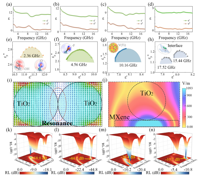 · e-h:MT-3的Cole-Cole曲線在2.36、4.56、10.16、15.44和17.52 GHz處出現(xiàn)半圓,證實存在多重極化弛豫(插圖為含–OH、–O、–F官能團及Ti空位缺陷的電荷密度差圖像)。