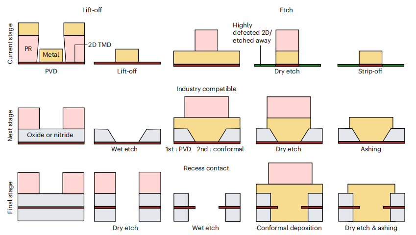 示意圖展示了二維半導體接觸形成的多種工藝路徑。當前‌剝離工藝(lift-off)‌ 因無法直接對二維半導體實施蝕刻而被廣泛應用。然而,剝離工藝仍非工業應用的終極解決方案。因此需開發新型平臺,改造傳統剝離工藝中的金屬材料以適應工業化需求。最終目標是為二維多片層FET實現‌保形接觸金屬篩選技術‌,該技術可構建‌凹陷式接觸(recessed contacts)。
