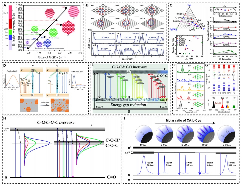 · ‌化學調控‌:(A) 助色團、(E) 雜原子摻雜、(I) 表面修飾;