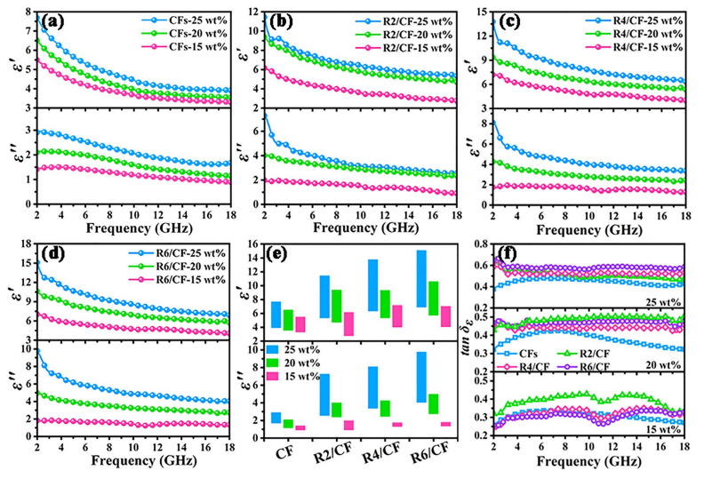 通過簡化的冷凍干燥-浸漬吸收-二次冷凍干燥-碳化工藝,可精密構建多功能二維/三維還原氧化石墨烯/碳泡沫(2D/3D RGO/CFs)范德華異質結構。研究結果表明,RGO的引入顯著優化了異質結構的阻抗匹配特性,并增強其極化損耗與傳導損耗能力。通過調控RGO含量和碳化溫度,可有效調節異質結構的電磁參數(EM參數)。