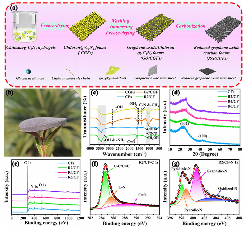 圖1.a) 二維/三維氧化石墨烯/膠原凝膠泡沫(2D/3D GO/CGFs)與還原氧化石墨烯/碳泡沫(RGO/CFs)范德華異質結構的實驗制備示意圖