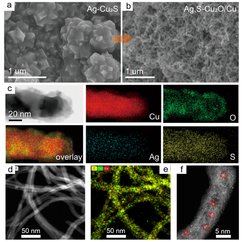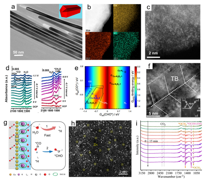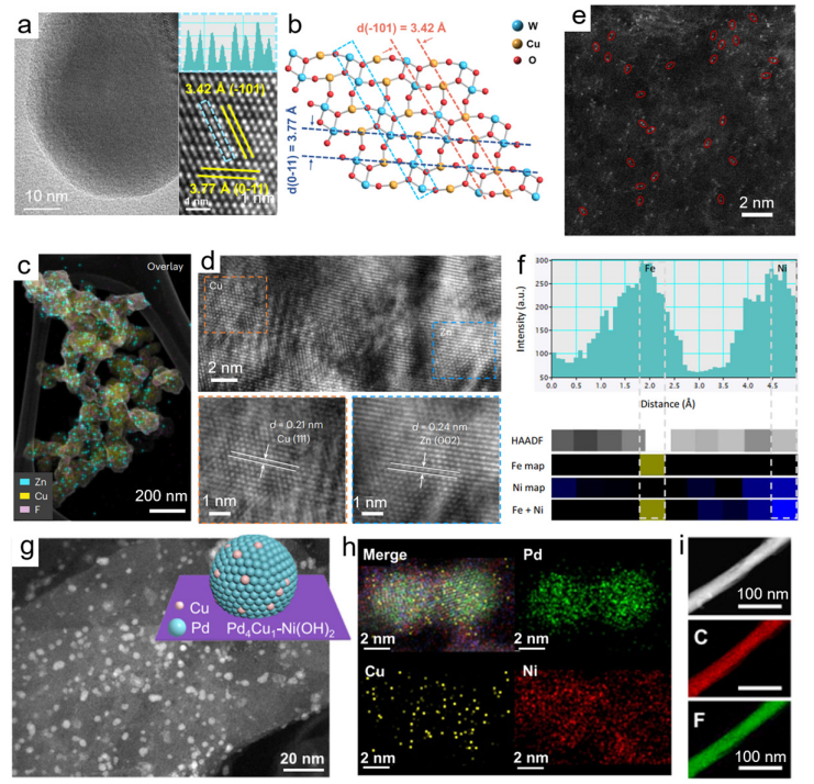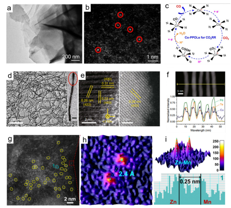 圖3 (a) Co-PPOLs的透射電子顯微鏡(TEM)圖像;(b) Co-PPOLs的球差校正高角環形暗場掃描透射電子顯微鏡(HAADF-STEM)圖像;(c) Co-PPOLs上電化學CO?轉化為CO的機理示意圖。經Ref. 52授權轉載,版權屬于Wiley-VCH出版社(2023年)。(d) 含0.10 wt% Cu的Pd??Te?納米線TEM圖像(內插圖比例尺:10 nm);(e) 圖3(d)內插圖對應的高分辨TEM(HR-TEM)及球差校正HR-TEM圖像;(f) HAADF-STEM圖像(上圖)及基于STEM-能譜(EDS)的線性分布分析(下圖)。經Ref. 17授權轉載,版權屬于Springer Nature出版社(2019年)。(g) Zn?Mn?-SNC催化劑的球差校正STEM圖像,黃色橢圓標示Zn-Mn雙金屬位點;(h) 圖3(g)中Zn-Mn雙位點的二維原子分辨率圖譜;(i) 圖3(h)中Zn-Mn雙位點的三維原子分辨率圖譜(上圖)以及圖3(g)藍色橢圓區域1的強度分布曲線(下圖)。經Ref. 57授權轉載,版權屬于Wiley-VCH出版社(2023年)。