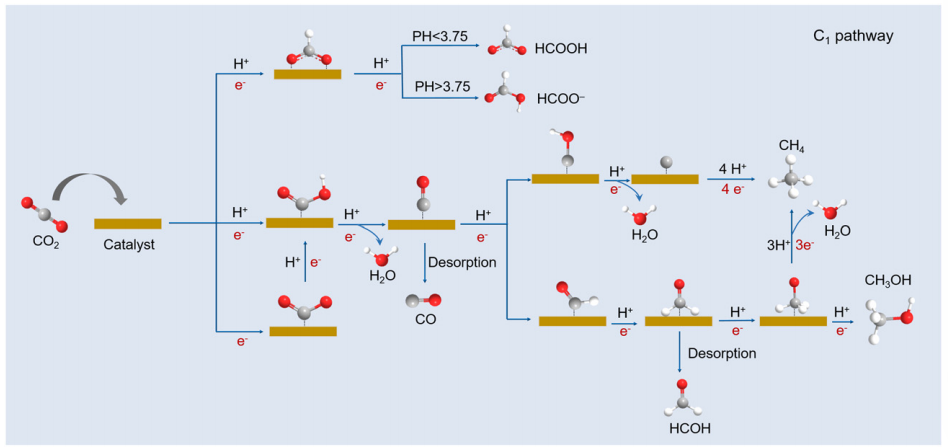 · *CO? + 2H? + 2e? → *OCHO → HCOOH(經由氧氫化羰基中間體)