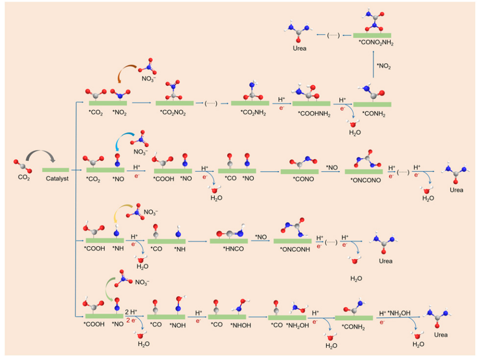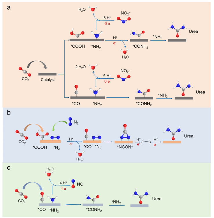 ② 右側路徑:創新性CO?/氮源共還原實現C-N鍵耦合,生成尿素、胺類等高附加值產物