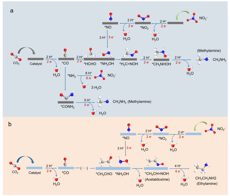 圖19 CO?與NO??電化學共還原生成(a)甲基胺(CH?NH?)、(b)乙醛肟(CH?CH=NOH)及乙胺(C?H?NH?)的生成機制圖解(參考文獻257, 316)