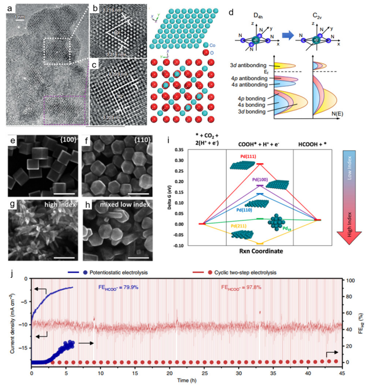 圖5 (a) 部分氧化的鈷4原子層高分辨TEM圖像。(b)(c) 放大的HR-TEM圖像及對應原子結構模型,清晰展示六方鈷與立方Co?O?的原子構型差異。經文獻70授權轉載,版權歸屬Springer Nature出版社(2016年)。(d) 具有D4h對稱性的平面CuN4基團與低對稱性(C2v)缺陷型CuN3基團的能帶位移及雜化示意圖。經文獻72授權轉載,版權歸屬Springer Nature出版社(2023年)。(e)-(h) 電極用鈀納米粒子SEM圖像:(e)立方體,(f)十二面體,(g)高指數晶面包覆枝狀粒子,(h)低指數晶面混合粒子。(i) CO?電還原制甲酸在Pd(111)、Pd(100)、Pd(110)、Pd(211)及Pd??團簇上的自由能圖。經文獻89授權轉載,版權歸屬美國化學會(2016年)。(j) 循環兩步電解與恒電位電解的電流密度和產物選擇性對比。經文獻74授權轉載,版權歸屬Springer Nature出版社(2019年)。